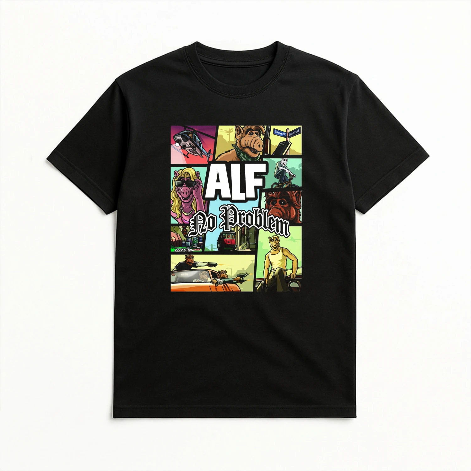 Le t-shirt noir “Alf Theft Auto” est un mashup audacieux qui fusionne deux icônes incontournables de la pop culture