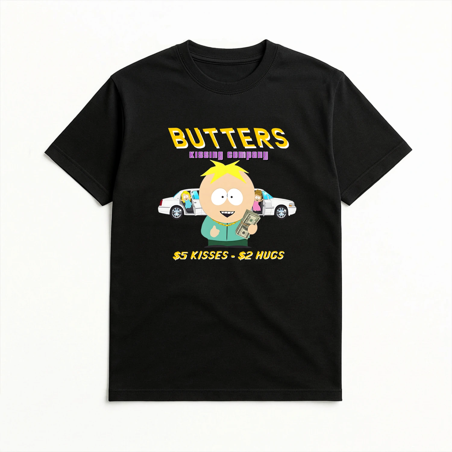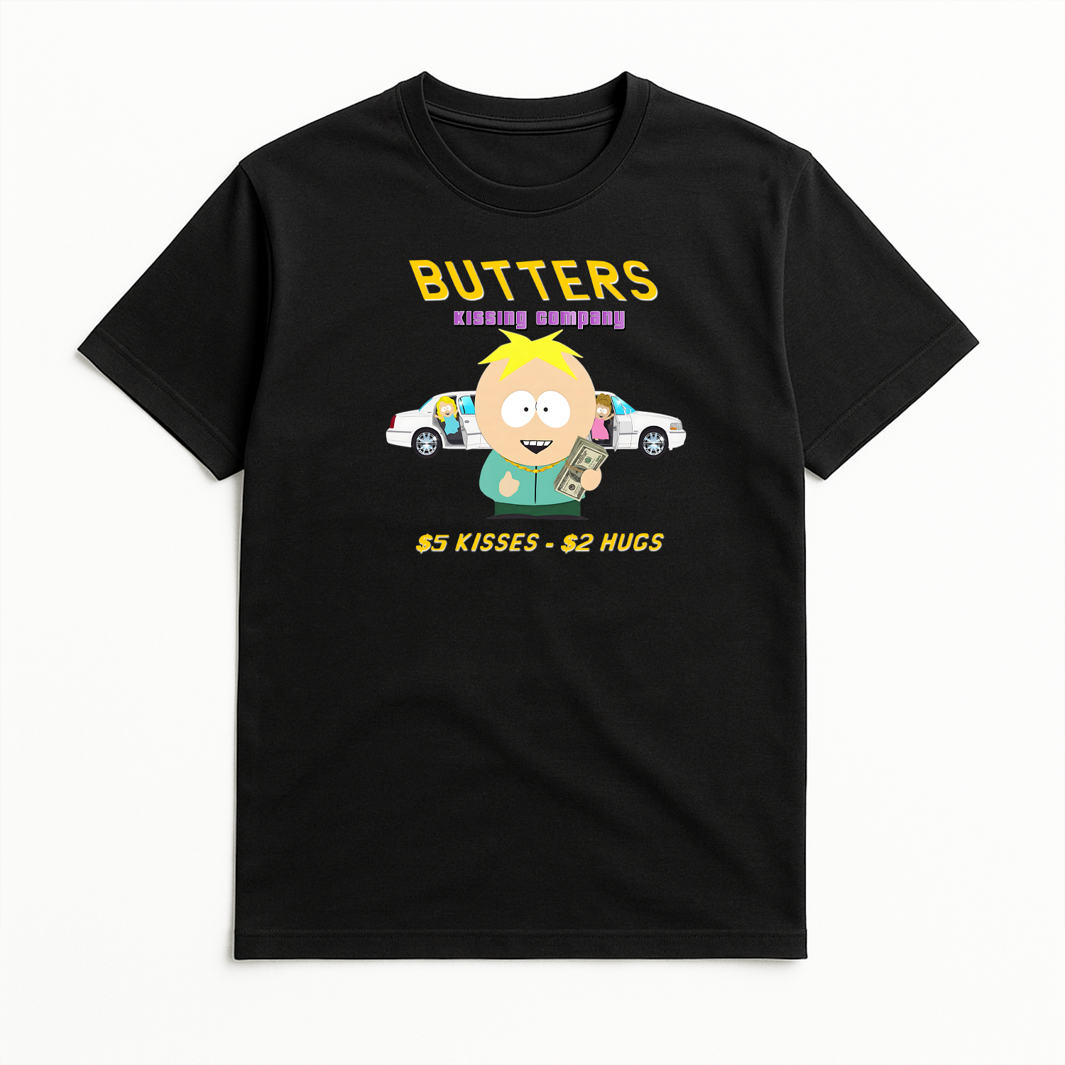 Inspiré d’un épisode culte de South Park, ce T-shirt noir met en avant le naïf Butters dans son rôle inattendu de boss de la “Kissing Company”. Une référence hilarante à l’un des moments les plus absurdes et iconiques de la série, où l’éternel innocent devient bien malgré lui le proxénète le plus connu du coin.
