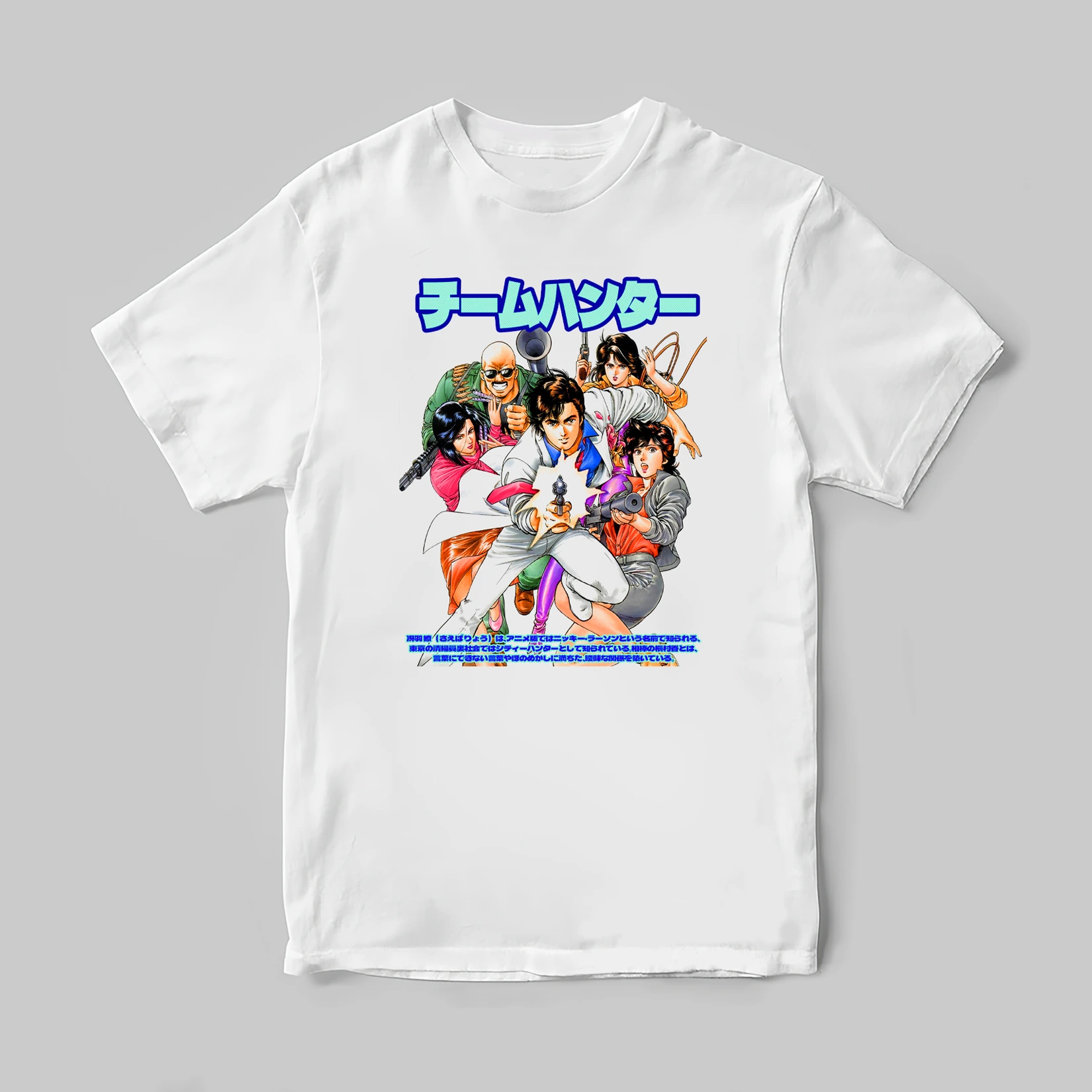 Retrouve toute l’intensité de City Hunter avec ce t-shirt blanc inspiré de l’univers emblématique de Nicky Larson (Ryo Saeba). Le visuel représente une scène de groupe explosive, où le célèbre nettoyeur et ses alliés apparaissent armes à la main, prêts à passer à l’action.