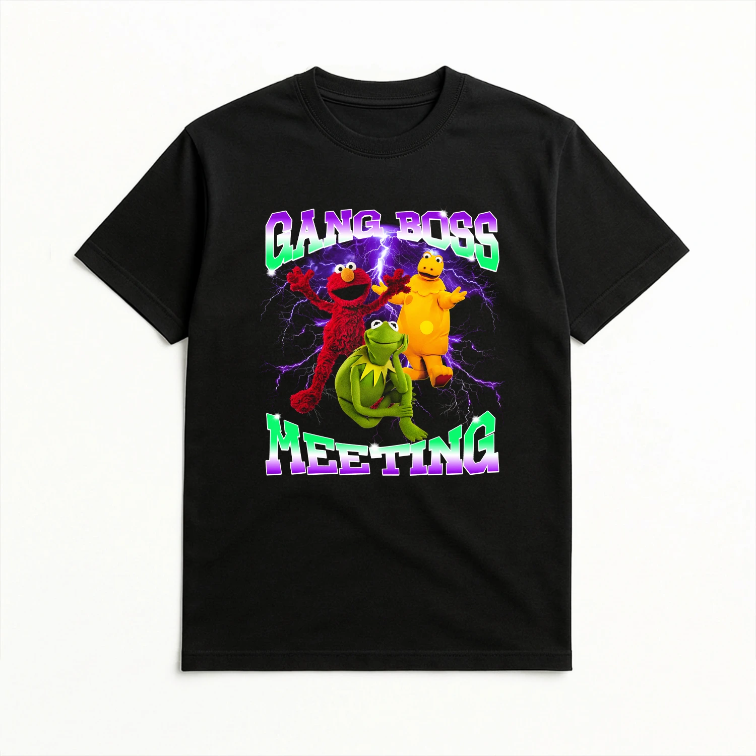 Adoptez l’esthétique streetwear à la mode avec notre t-shirt exclusif « Gang Boss Meeting ». Ce modèle rend hommage aux t-shirts de rap bootleg des années 90/2000, mixant des éclairs électriques, une typographie chrome rétro et un trio de choc totalement inattendu : Kermit la grenouille, Elmo et l’inoubliable Casimir.