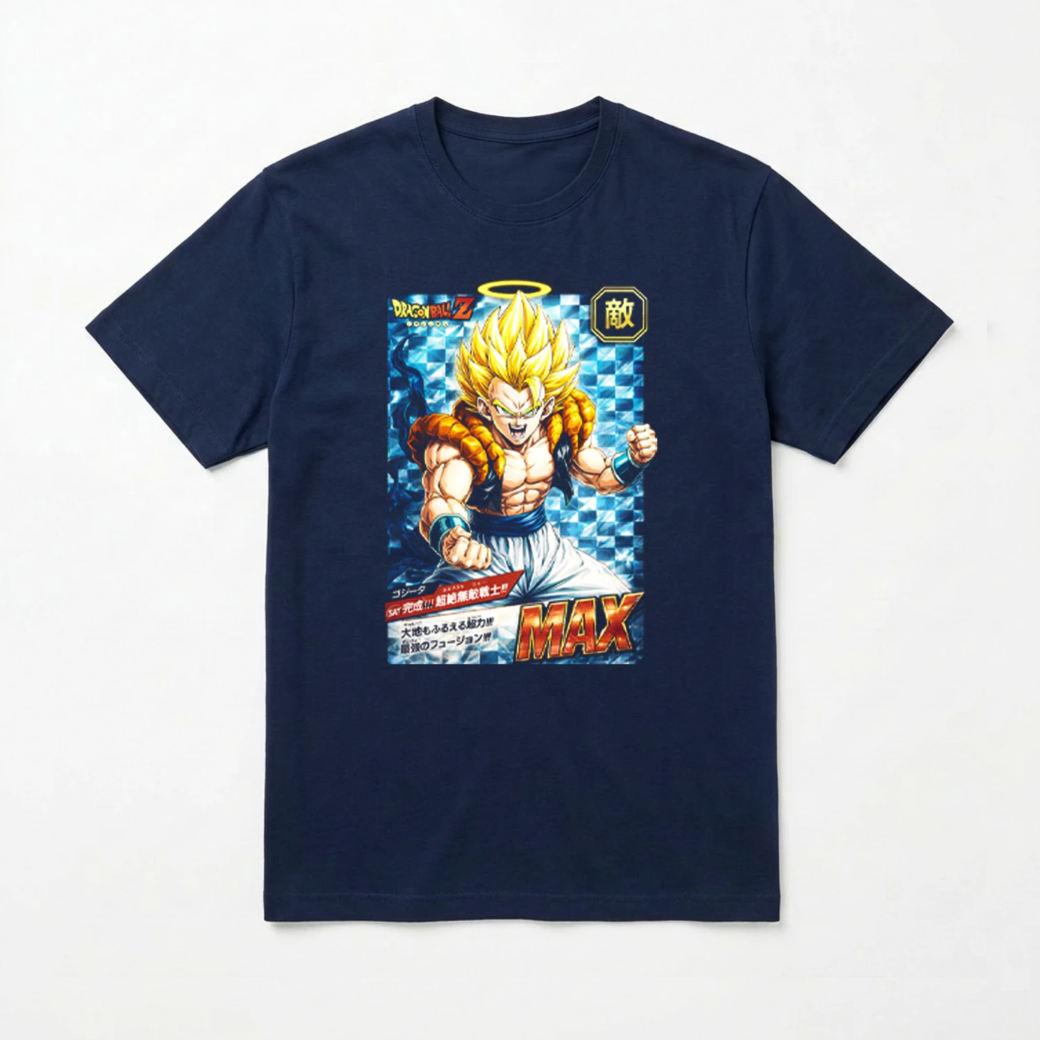 Plonge dans l’univers légendaire de Dragon Ball Z avec ce t-shirt dédié à Gogeta, la fusion mythique de Goku et Vegeta, revisité dans un style inspiré des cartes à jouer japonaises rétro.
