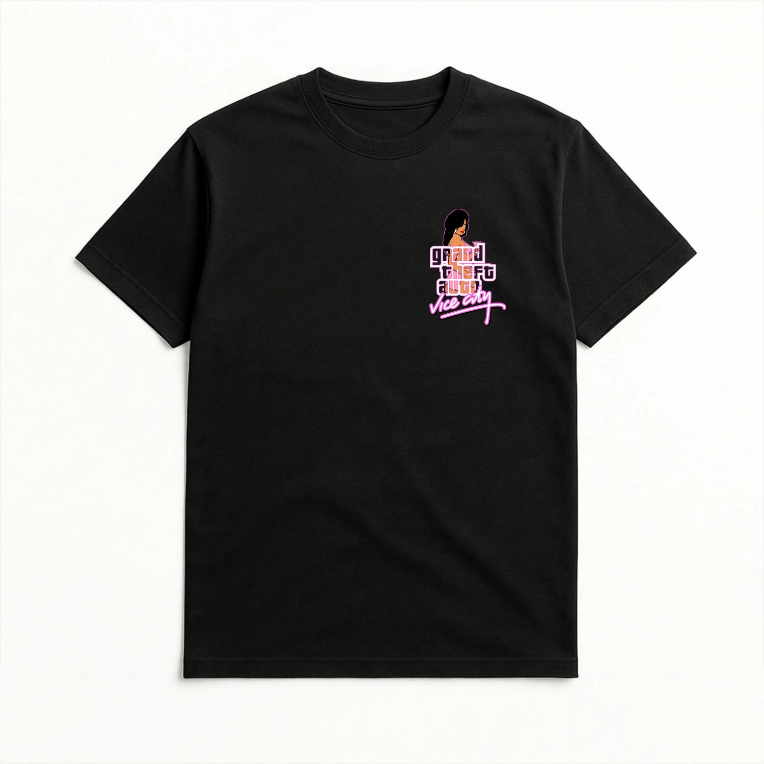 Le visuel, placé côté cœur, capture l’essence rétro et vibrante de Vice City, parfait pour les fans de la série Grand Theft Auto et ceux qui aiment afficher un style nostalgique et audacieux.