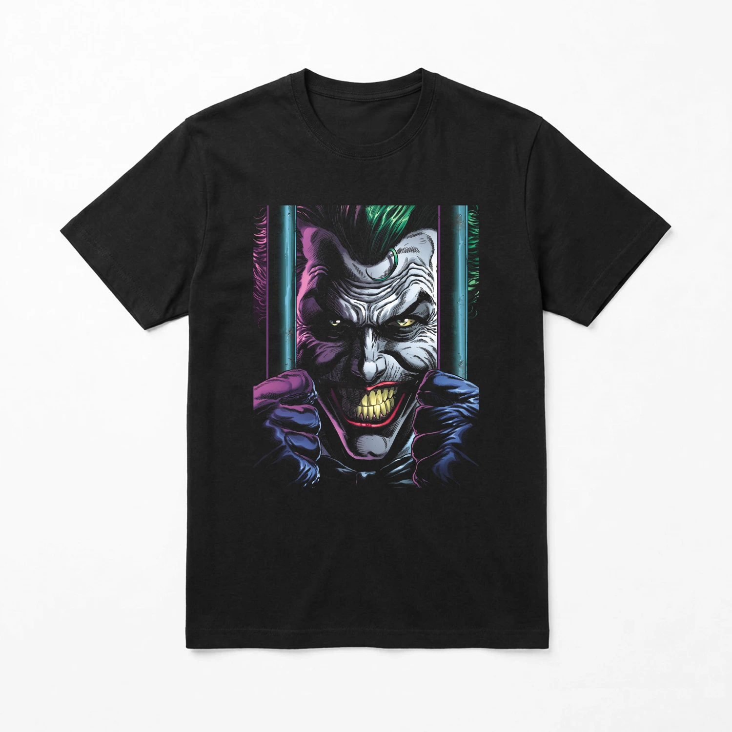 Affiche un style sombre et iconique avec ce t-shirt noir Joker au design intense. Le visuel montre un Joker menaçant derrière des barreaux avec un sourire inquiétant et des couleurs néon qui ressortent parfaitement sur le fond noir.