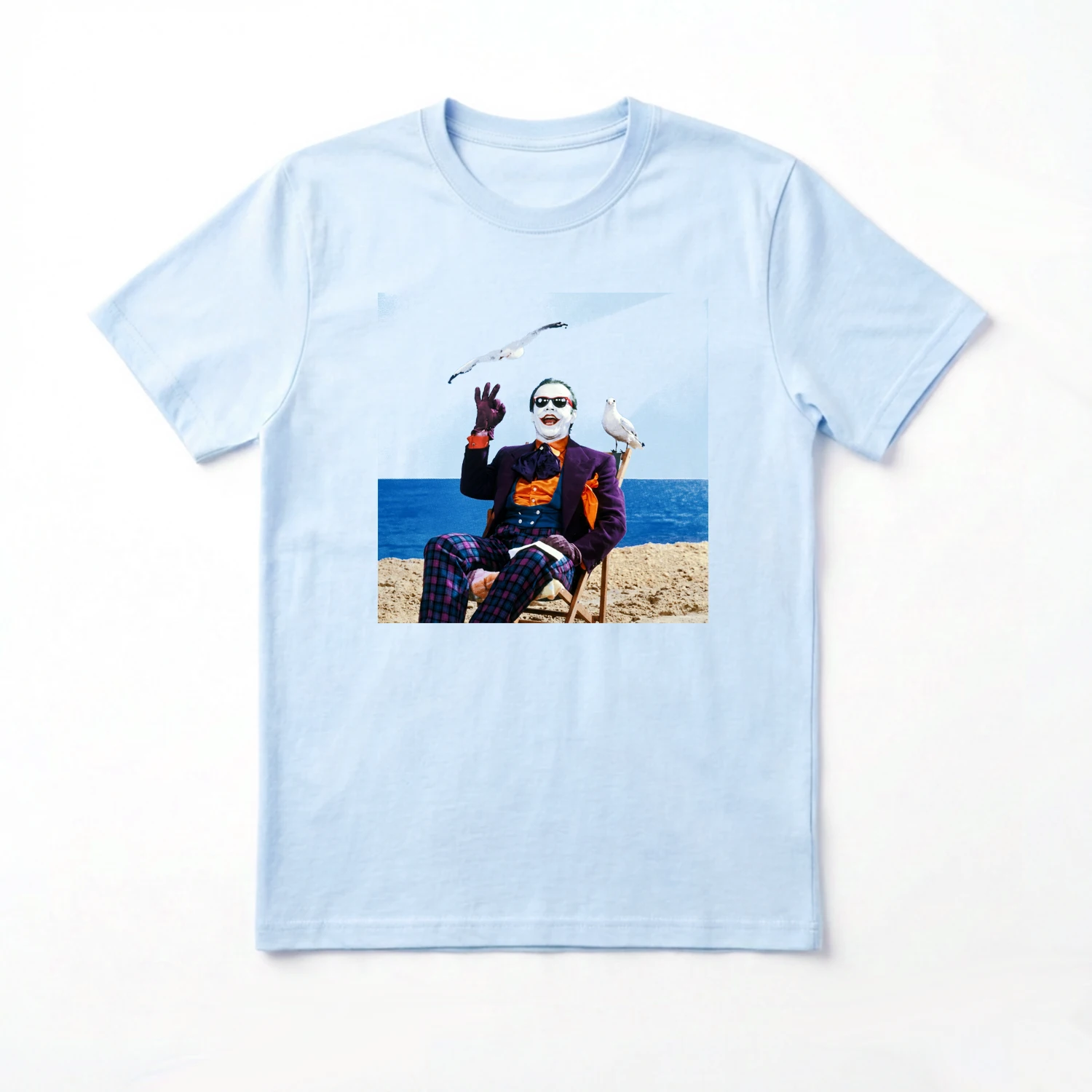 Le t-shirt bleu ciel “Joker Plage” revisite une icône mythique du cinéma dans une scène totalement inattendue.