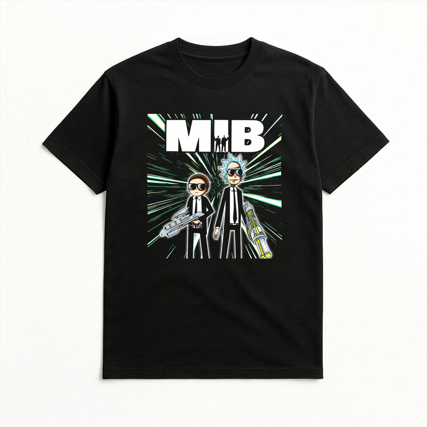 Découvrez ce t-shirt noir MIB Rick and Morty, une parodie originale qui fusionne l’univers délirant de Rick and Morty avec le style iconique des Men in Black. Le design montre Rick et Morty en agents secrets vêtus de costumes noirs, lunettes sombres et attitude sérieuse façon MIB… ou presque !