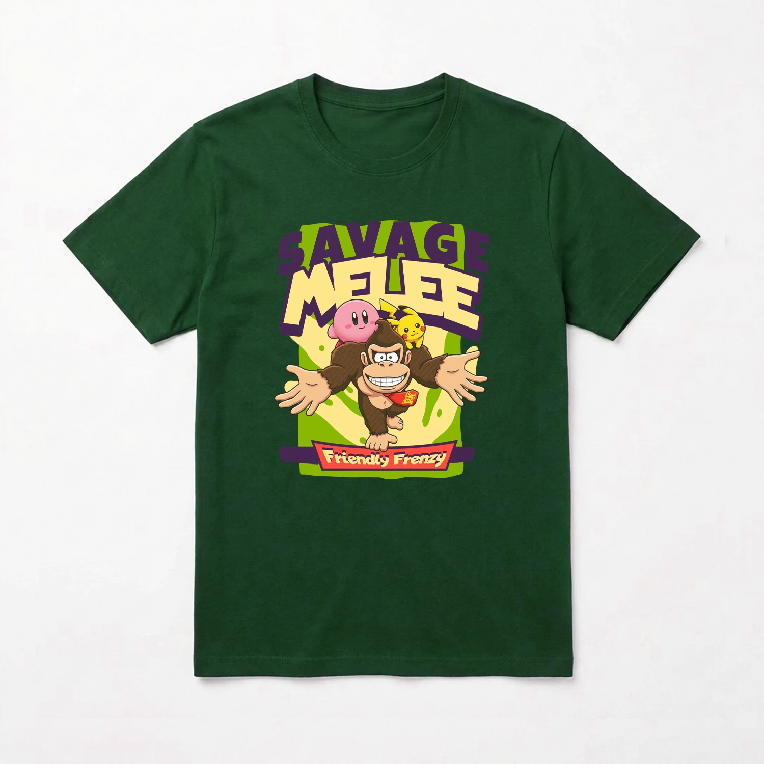 Affichez votre passion pour le jeu vidéo culte avec notre t-shirt « Savage Melee » disponible en noir et vert forêt.