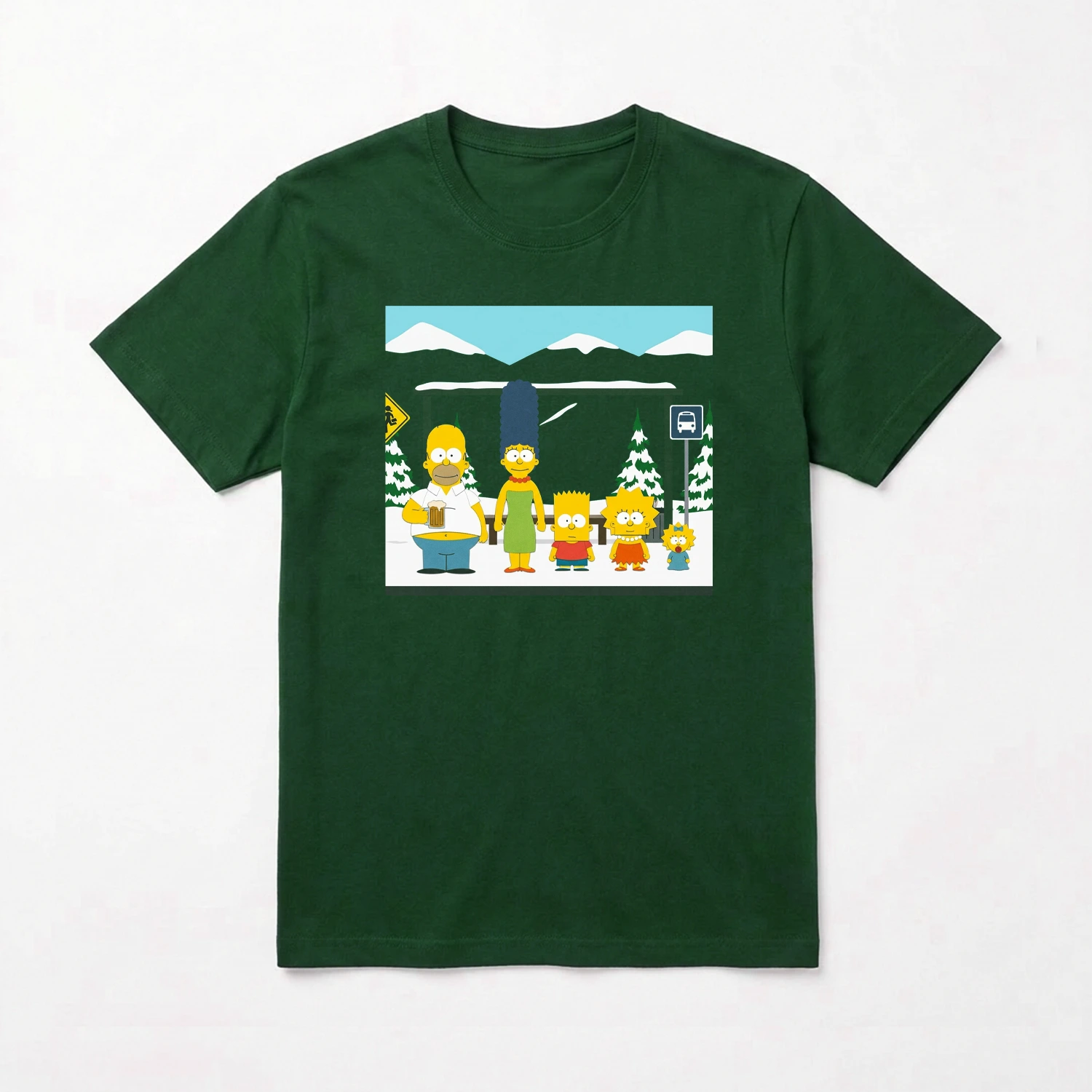 Plongez dans un mashup hilarant avec notre t-shirt « South Field » couleur vert forêt, où les Simpsons rencontrent l’univers de South Park.
