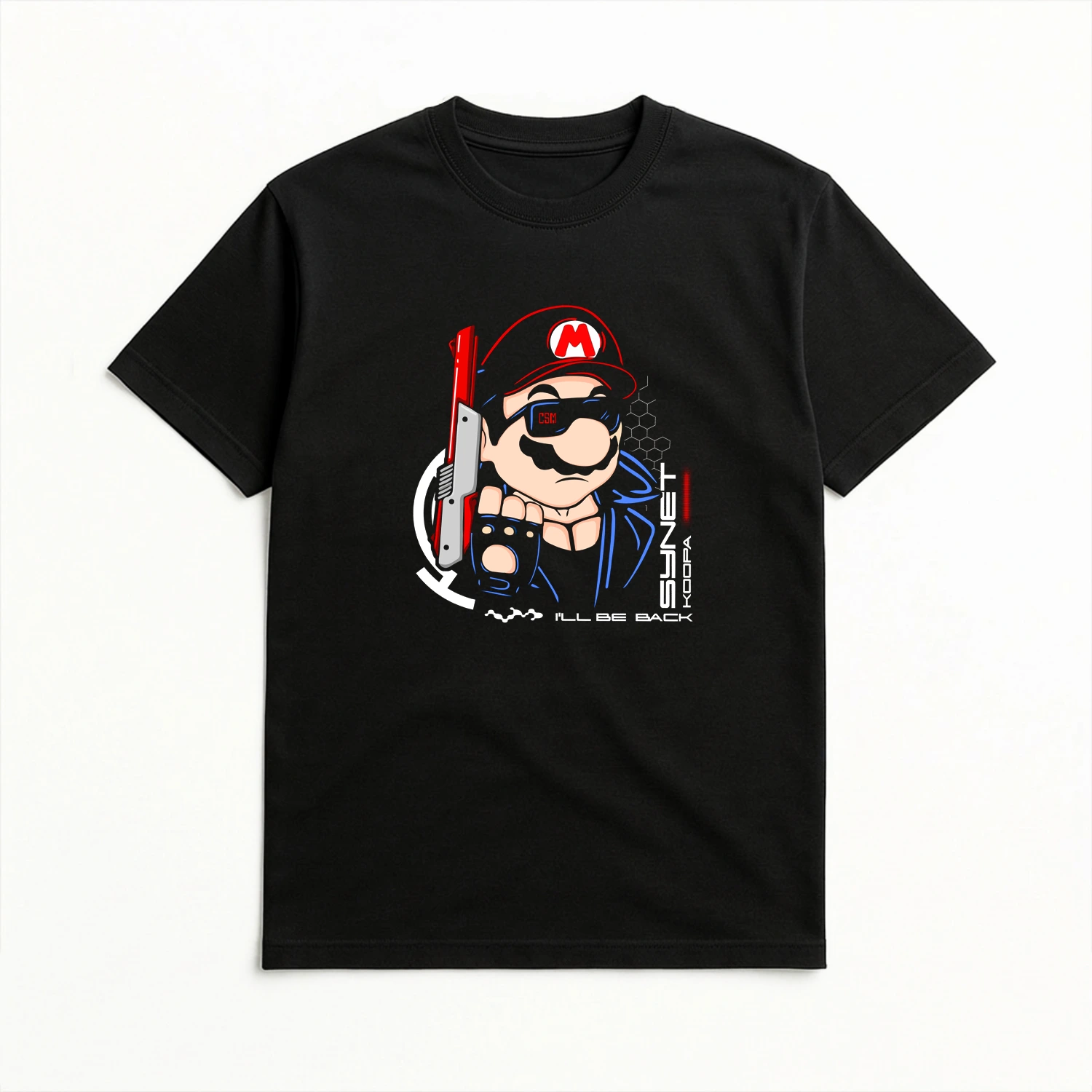 Affirme ton style avec ce T-shirt noir Termimario, un design parodique audacieux qui fusionne l’univers d’un héros de jeu de plateforme rétro avec l’imagerie d’un cyborg venu du futur Terminator. On y découvre un personnage inspiré du célèbre plombier moustachu, relooké façon T-800 avec un style plus sombre, métallique et futuriste.